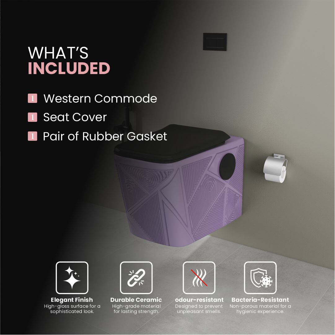 | Box Contents (Inclusions) | 1 Wall Hung Water Closet, 1 Slow Motion Seat Cover, Freebie : C P Rack Bolt-Screw Pair, Inlet & Outlet Rubber Gaskets |